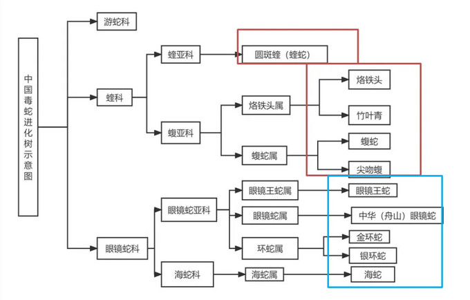 这时候我们要搬出中国毒蛇进化树示意图(下图),这张图相当于中国毒蛇的家族族谱。图中可以看到蝰亚科和蝮亚科的蛇都属于蝰科的,从生物学上来说,这两个分支属于亲戚关系,蛇毒成分比较接近,就可以使用同一种血清,这就是血清使用的原则之一——同种专一,异种联合。第一种情况,被五步蛇咬伤、眼镜蛇咬伤、银环蛇咬伤、蝮蛇咬伤,使用对应的蛇毒血清即可;第二种情况,竹叶青蛇咬伤、烙铁头蛇咬伤、圆斑蝰蛇没有对应的蛇毒血清,则可以使用抗五步蛇毒血清或(和)抗蝮蛇毒血清;眼镜王蛇咬伤使用抗银环蛇毒血清和抗眼镜蛇毒血清;金环蛇咬伤使用抗银环蛇血清。