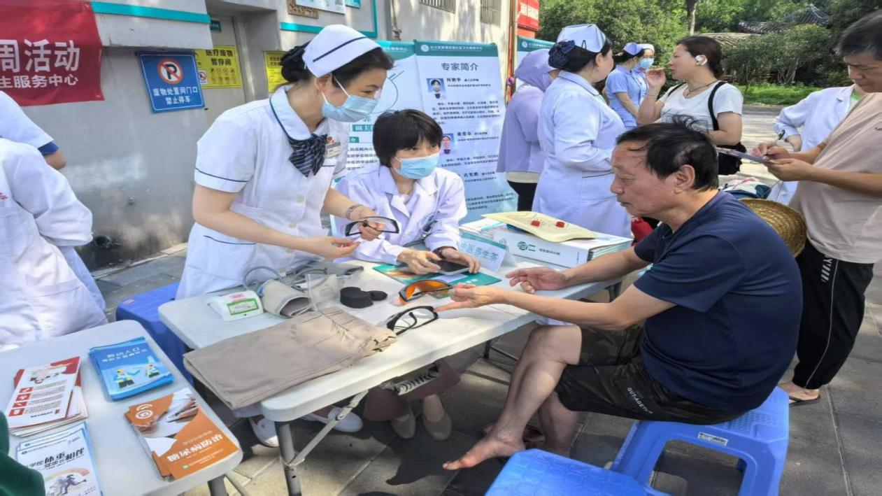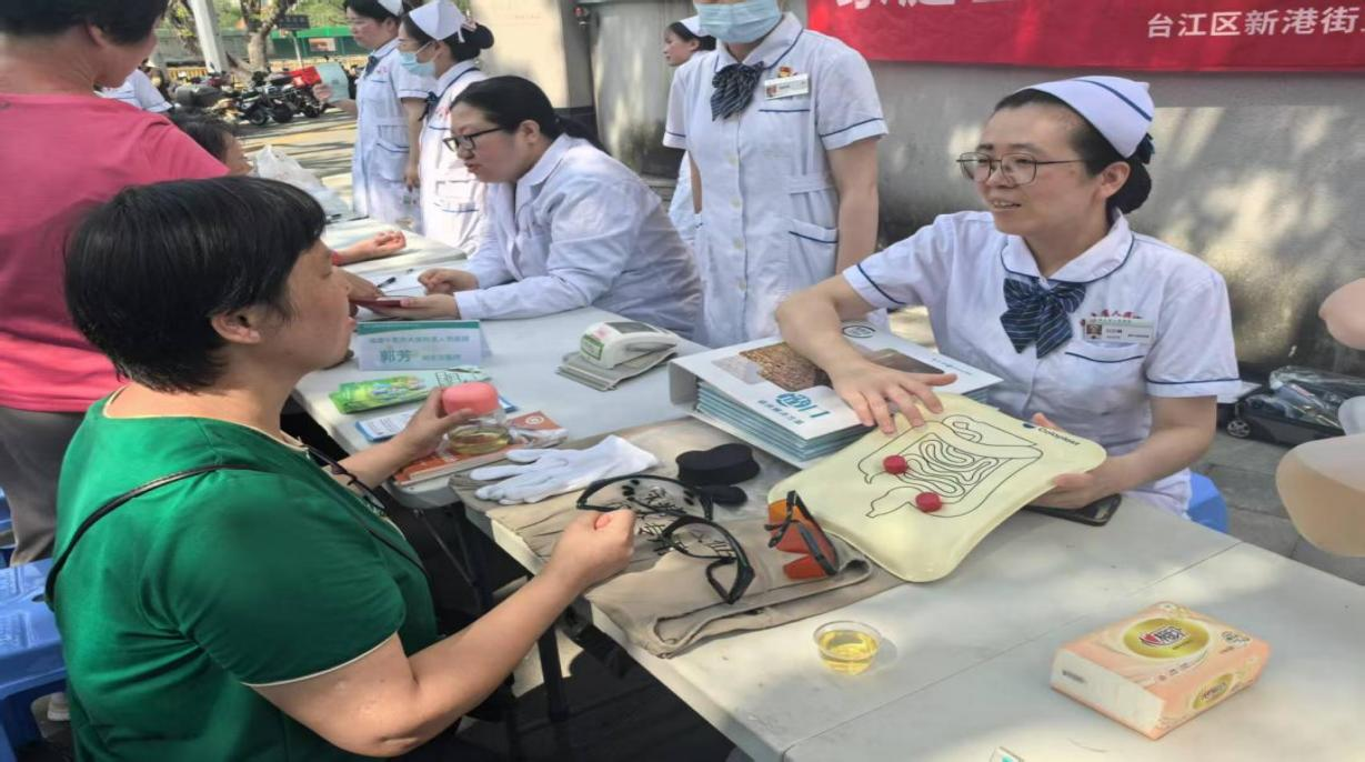 针对老年人高发的慢性病问题,义诊团队设置了免费测量血糖,为老年居民提供快速检测和结果解读,帮助早期发现血糖异常;通过模拟道具让老年居民感受糖尿病周围神经病变等并发症的危害,增强控糖意识;造口专科护士手把手教授造口换药知识,帮助术后患者掌握科学的居家护理技巧。