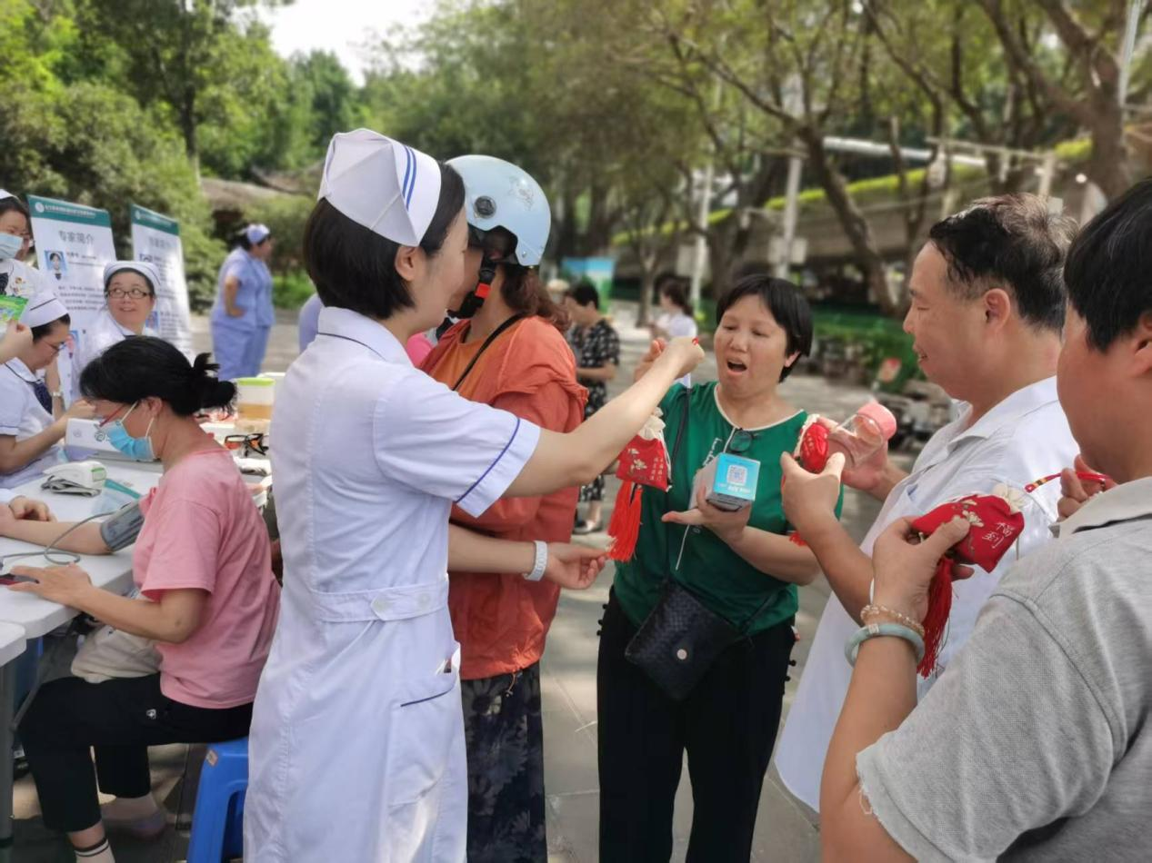 义诊活动接近尾声,义诊团队为到场的老年居民赠送了中医特色香囊。这些香囊具有避瘟防病的功效,香味浓郁,承载着护理人员对老年居民的深情厚谊与美好祝愿。