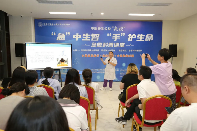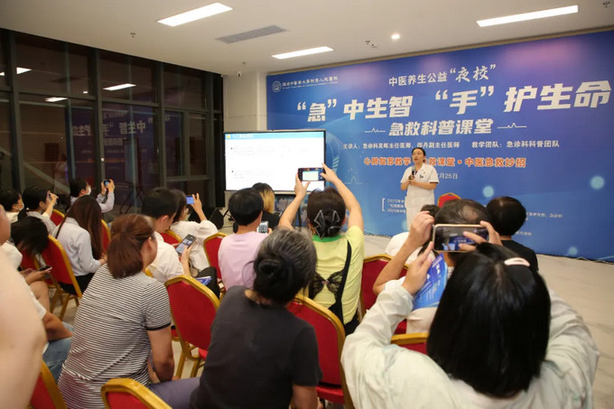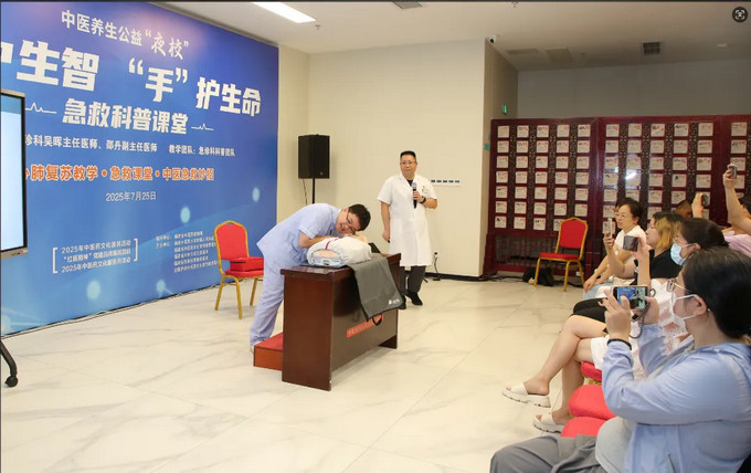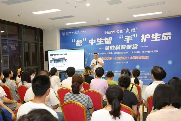7月25日晚,黄播 7号楼1层灯火通明,一场以《“急”中生智 “手”护生命》为主题中医公益夜校在此启幕。原定的35个活动名额早就被抢报一空,到场人数翻番,现场爆满,市民们带着对急救知识的渴望与对中医的好奇,共同开启了一场知识与趣味并存的生命守护之旅。夏日礼包、养生茶饮、健康“抚胃操”……让这场夜校不仅成为一次实用知识的学习,更带来了贴心的关怀与体验。