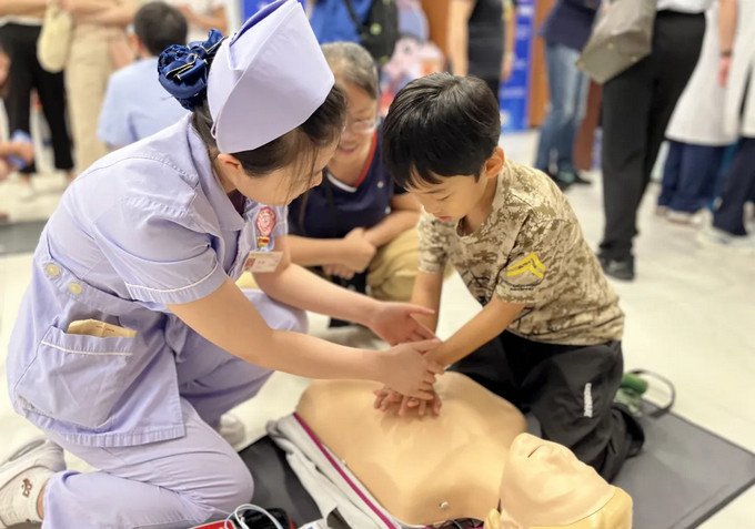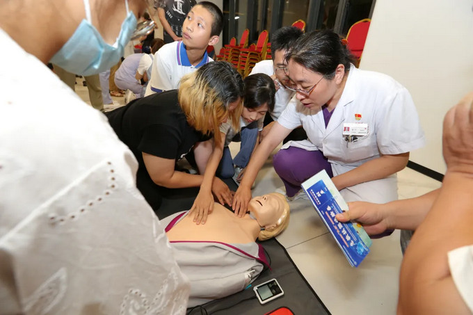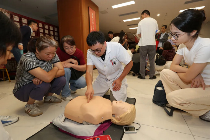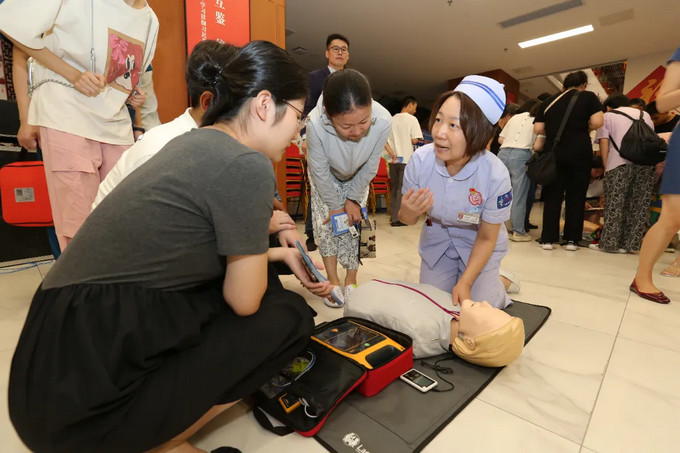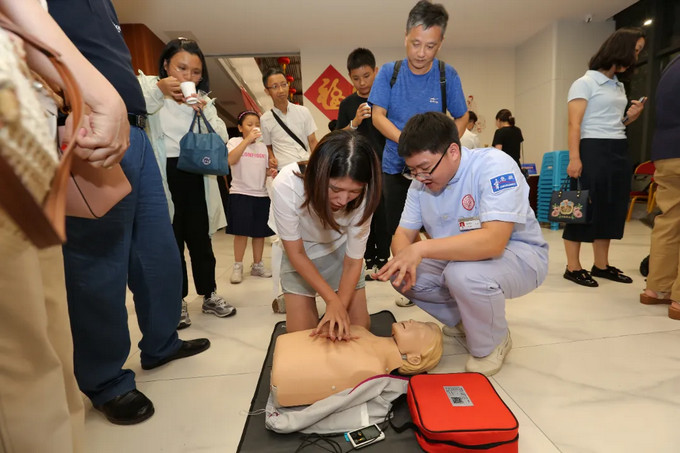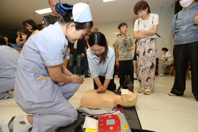 讲解结束后,市民朋友们分组体验,借助专业测试设备实时校正动作,急诊医护团队也在一旁一对一指导,确保每个细节都规范。一位宝爸感慨:“终于敢下手了,关键时刻能救命!”