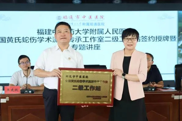 副院长施婉玲在讲话中详细介绍了黄氏蛇伤学术流派的发展历程与学术成就,该流派源自福建龙岩,近百年间历经五传,1958 年传入榕城后,第二代传承人黄守林在祖传秘方基础上创制多种特效蛇药,被誉为与季德胜齐名的中国 “四大蛇医”。经过 60 余年发展,流派已组建福建省蛇伤救治中心,形成中西医结合、科研教学协同的专科体系,并在多省设立22个二级工作站,有效提升了基层蛇伤救治能力。且福建与昭通、黔南气候温暖湿润、山林资源丰富,毒蛇分布特征相似,在蛇伤防治领域有着广阔的合作空间。