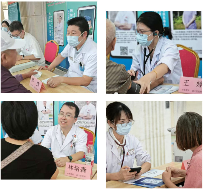 林培森副主任、林伟副主任、王婷副主任、丘春燕主治医师为到场的患者进行了仔细的心脏听诊、耐心地解读检查报告,讲解了如何进行家庭血压测量,血压控制目标等内容,推广正确的血压测量方法,并耐心为患者答疑解惑。