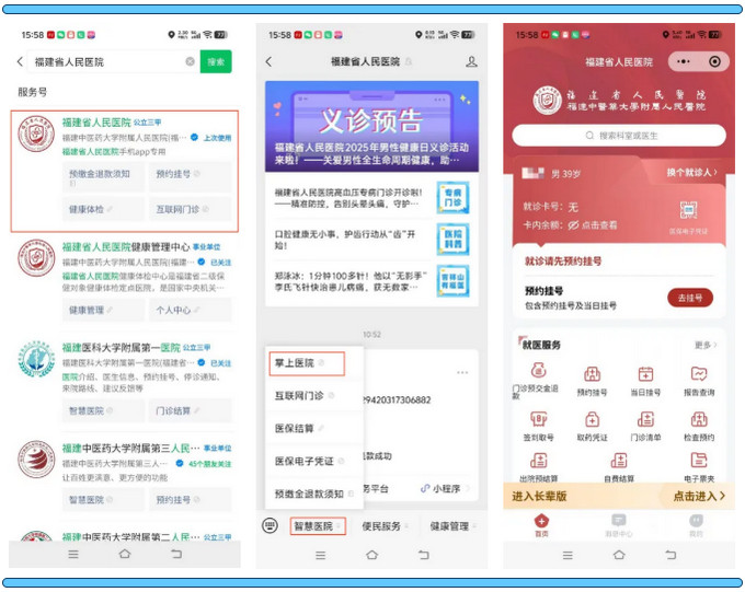 第二种方式:微信服务号搜索“福建省人民医院”——“智慧医院”——“掌上医院”——“门诊预交金退款”进入服务页面。