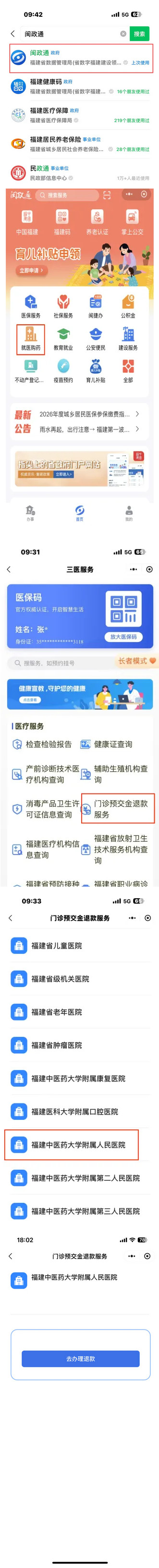 第三种方式:打开微信“闽政通”小程序—“就医购药”—“门诊预交金退款服务”,选择要退款的医院。