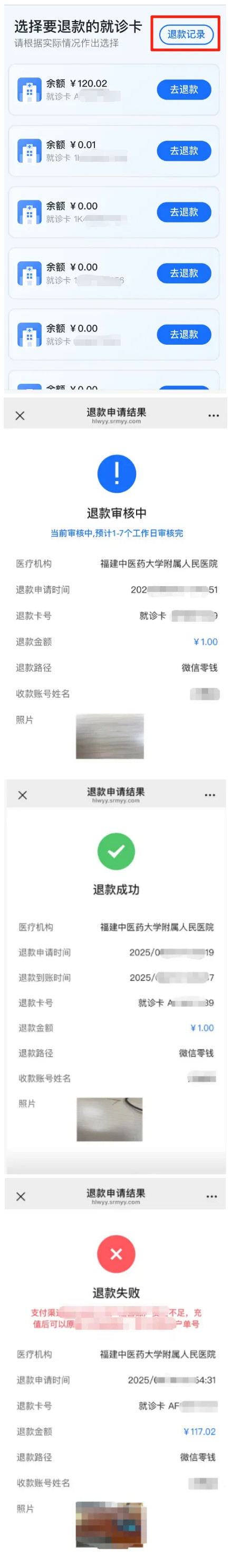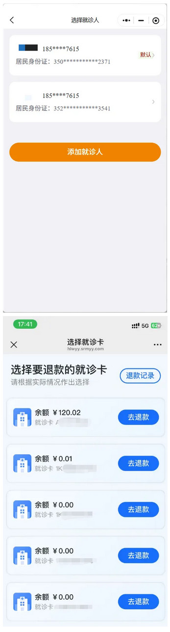 1.选择要退款就诊人以及对应的就诊卡,点击【去退款】;