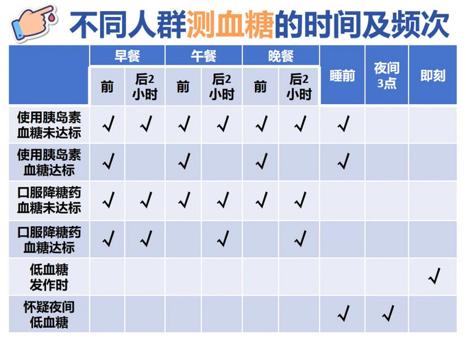 ●监测时间:推荐根据不同的血糖控制方案选择监测血糖的时间点,来帮助了解饮食和活动对血糖的影响:如早餐前、午餐后2小时、晚餐前。