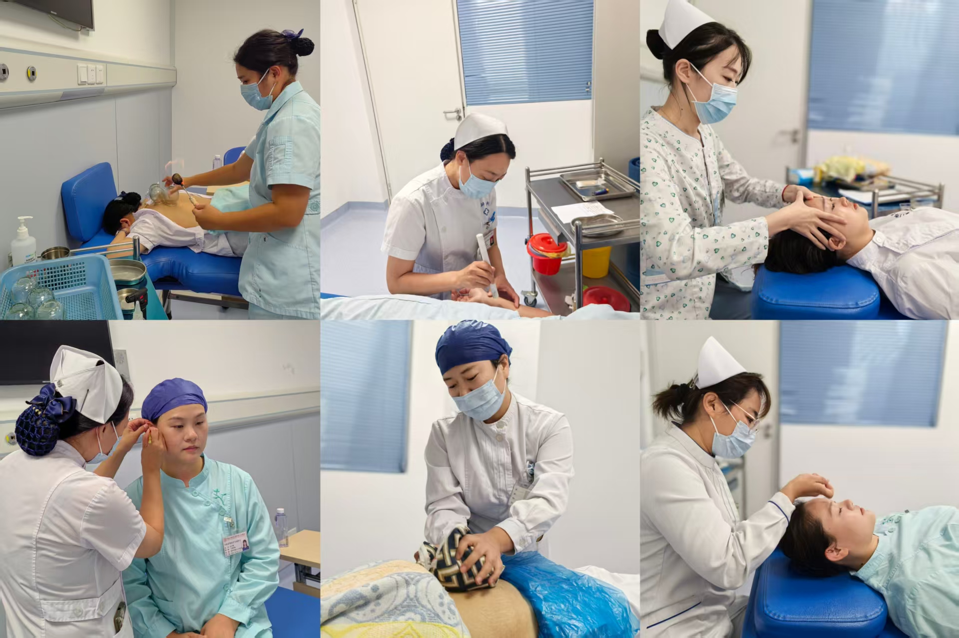 培训围绕六大常见症状辨证施护、多项常用及特色中医护理技术开展系统训练,构建了科学、规范、实用的临床教学体系。在为期四周的培训中,学员通过轮转科室、参与实操、跟师学习等方式,全面提升中医辨证施护能力与专业技术水平。学员深入参与优势病种护理方案实施,开展疼痛、失眠、便秘等六大症状的中医辨证施护,并完成艾灸、拔罐、刮痧等多项中医技术的临床实践。在“一对一”带教的指导下,做到“技精于练、知行合一”。