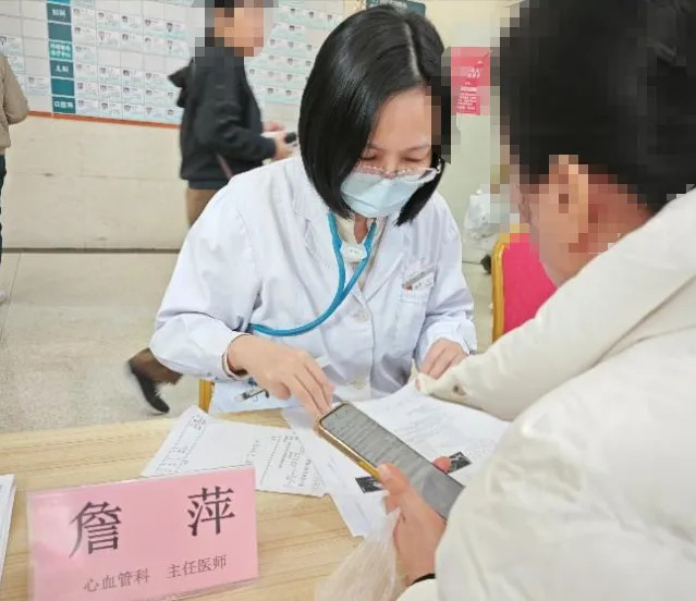 ▲詹萍主任医师为前来咨询的冠心病患者讲解冠心病相关知识,解除患者疑虑,并为患者提供耐心的诊疗建议、指导合理用药、后期康复等。