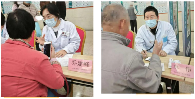 ▲乔建峰主任医师、林伟副主任医师为胸闷痛不适的患者义诊,告知患者目前症状呈典型“冠心病”表现,建议患者住院检查,做“冠脉造影”明确诊断,患者认真听取了医师的建议。