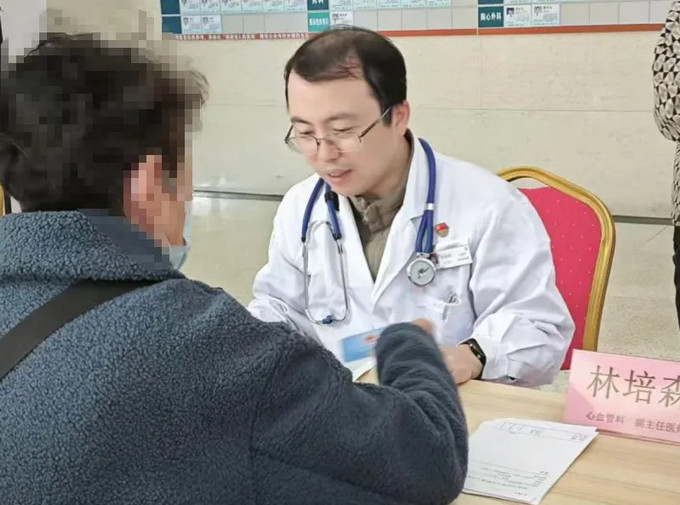 ▲林培森副主任医师为介入术后的患者讲解规则服用药物的重要性、注意事项和不良反应,并为患者提供细致的健康教育,帮助其建立健康的生活方式,并为患者开具义诊处方。