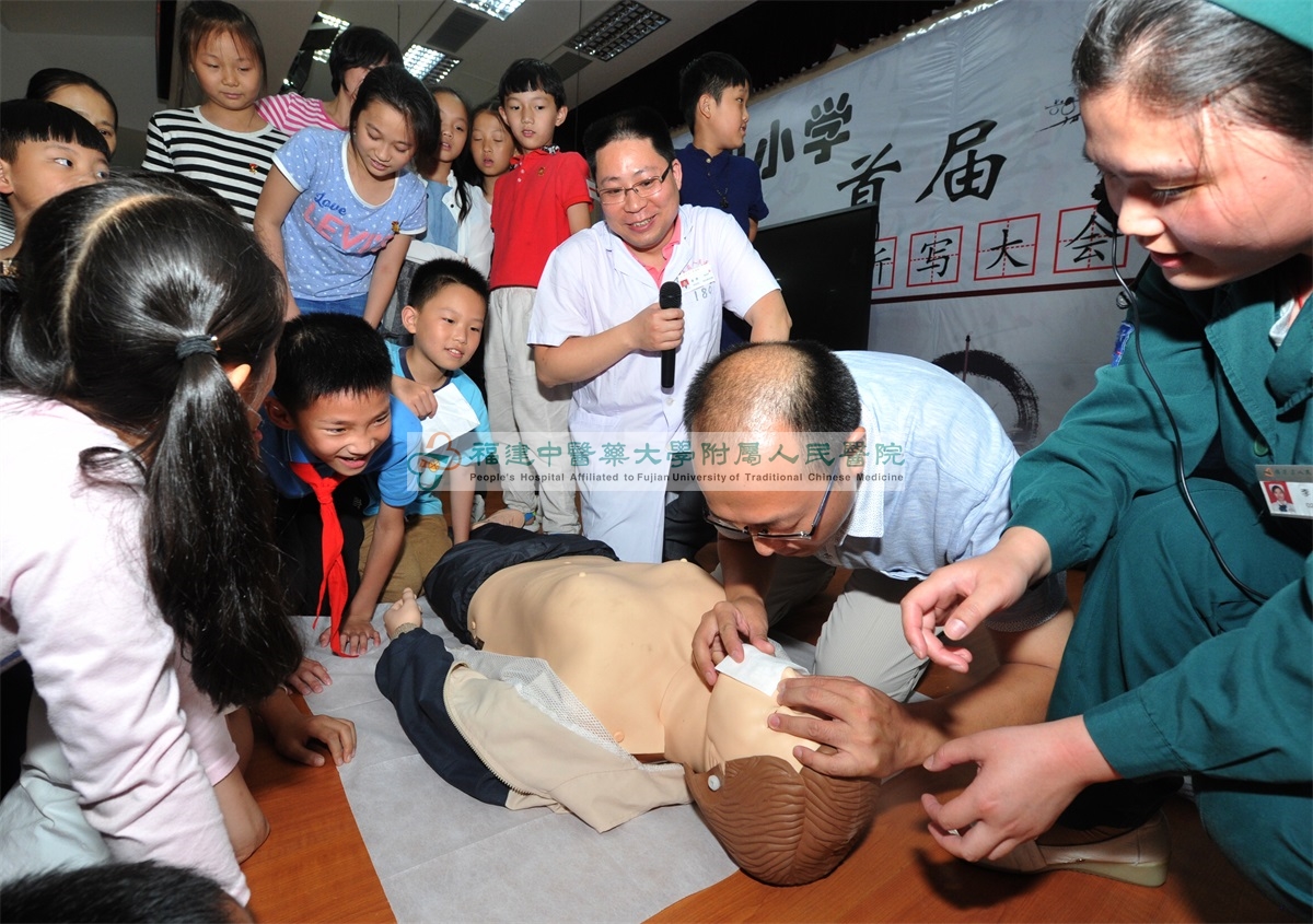 急诊科医务人员走进福州金山小学,借助模拟人现场演示急救方法,手把手教师生一起学习急救操作技巧。