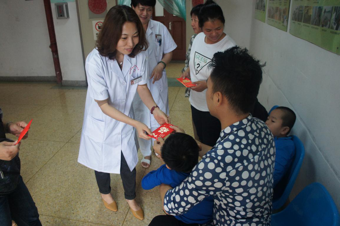2017年是院党委启动“爱心结对帮扶特困家庭患病儿童”活动的第六年, 6月3日上午,院党委联合康复科开展“爱心结对帮扶特困家庭患病儿童”活动,为在黄播 康复科就诊的患儿送去“六一儿童节”的祝福和慰问。院党委副书记、纪委书记李艺华,办公室副主任邓影,康复科主任黄卿为三位结对帮扶的患儿每人送上了3000元的帮扶资金。