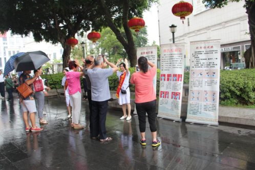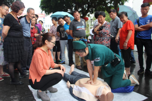 虽然零星下着小雨,在潮湿的地面上,急救护理专家不厌其烦为群众培训徒手心肺复苏。“就像会骑自行车一样,我们希望简单的急救常识人人都会,这样在紧急的时刻能救人一命。”急诊科护士说。