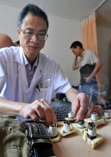 昨日8时许,7号楼针灸科施灸点,上至八九旬老者,下至五六岁孩童,都静静趴在桌面上,医护人员井然有序地为他们服务:放姜片在相关穴位,再放置艾柱,小心点燃……
