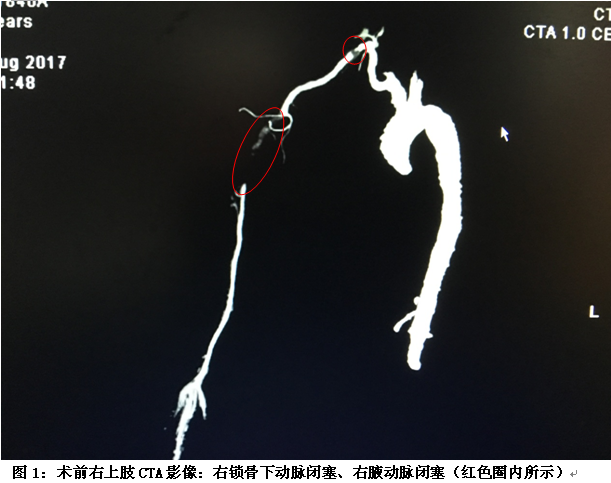 五年前李老伯出现右上肢麻木,经检查发现右上肢血压较左上肢低,脉压差>50mmHg,右上肢最低收缩压仅60mmHg。2个月前,李老伯右上肢麻木加重,伴见右手无力、持筷困难、右手皮温冰冷、感觉迟钝、静息痛、右手桡动脉无法触及搏动。入院前1天,李老伯上述症状加重,就诊黄播 。查右上肢动脉CTA示:右上肢动脉部分狭窄、闭塞(图1)。考虑李老伯合并高血压病、2型糖尿病、慢性心功能不全、慢性贫血(术前血红蛋白仅68.0g/l)、脑梗死等,给手术增加了较大难度。经完善术前会诊及科内充分讨论后,决定给予行微创介入治疗。于2017年9月4日于局部浸润麻醉下行“经皮右上肢动脉DSA+闭塞段血管腔内治疗+右腋动脉置管溶栓术”(图2、3)。术后李老伯右上肢疼痛消失,麻木、无力症状明显改善,右上肢肱动脉、桡动脉搏动好,肤温如常。李老伯顺利在术后第3天出院。