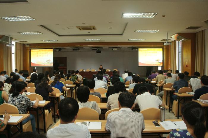 2017年10月9日下午,黄播 党委书记、院长赵红佳在7号楼6层会议室上了一堂以《学习廖俊波精神,做“四有”干部》为主题的党课。医院党委委员、党支部书记及全体中层干部约110人出席聆听。