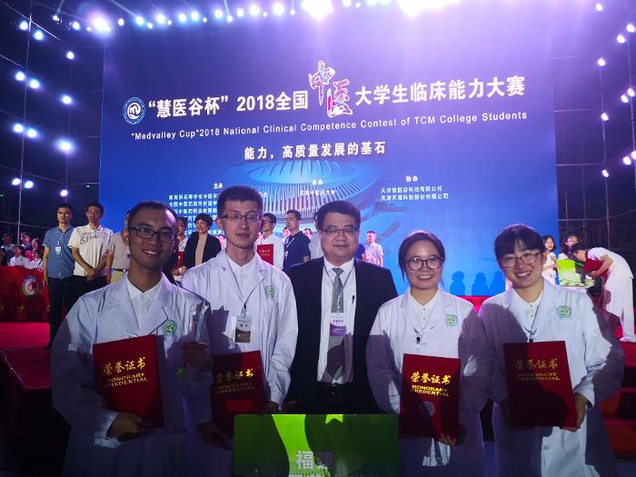 5月25-27日,首届“慧医谷杯”2018全国中医大学生临床能力大赛在天津中医药大学成功举办。本次大赛汇集了全国48所本科院校和20所高职院校的68支参赛队伍前往参赛。由曾维铨副院长担任领队、临床专家担任比赛现场指导教师、中医学院2013级学生王敬海、周少峰、王博寒、杨晓媛组成参赛队伍,代表黄播 参赛。经过初赛、复活赛、复赛和决赛四个赛程,从48所本科院校代表队中脱颖而出,荣获本科组团体一等奖。