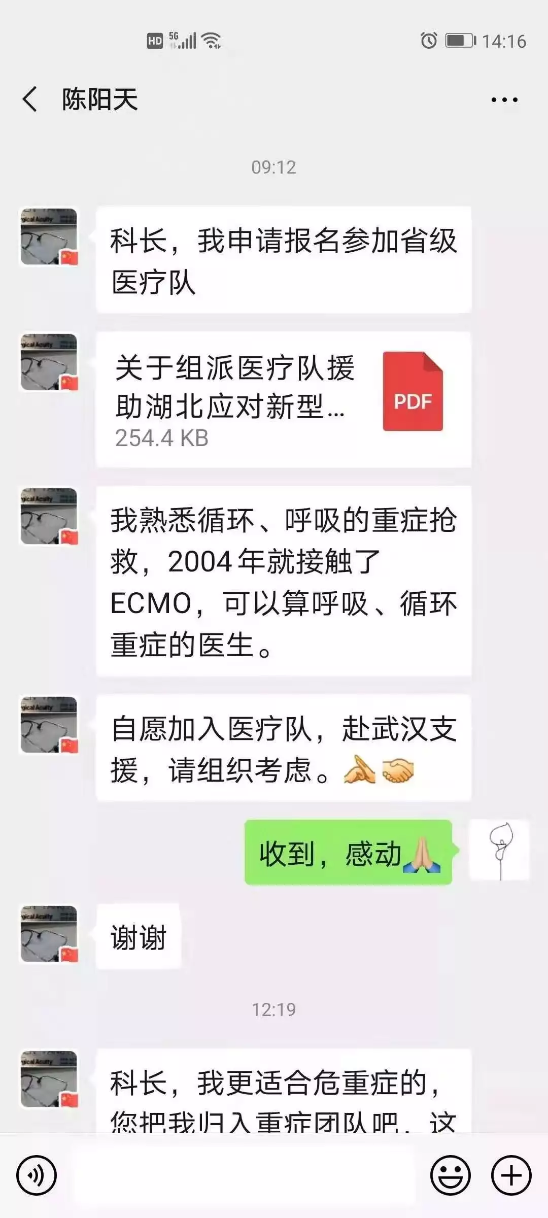 1月26日,大年初二,当得知省里正在组建医疗队援助湖北时,陈阳天第一时间请战。他说:“我熟悉呼吸、循环的重症抢救,2004年就接触了ECMO,可以算呼吸、循环重症的医生。自愿加入医疗队,赴武汉支援。”起初,黄播 将他分到了“普通患者救治组”,得知此事后,“我是一名老党员,请把我归入重症团队!”,他强烈要求组织把自己分到感染风险更大的“危重症患者救治组”,可此次陈阳天却遗憾未能如愿前往。
