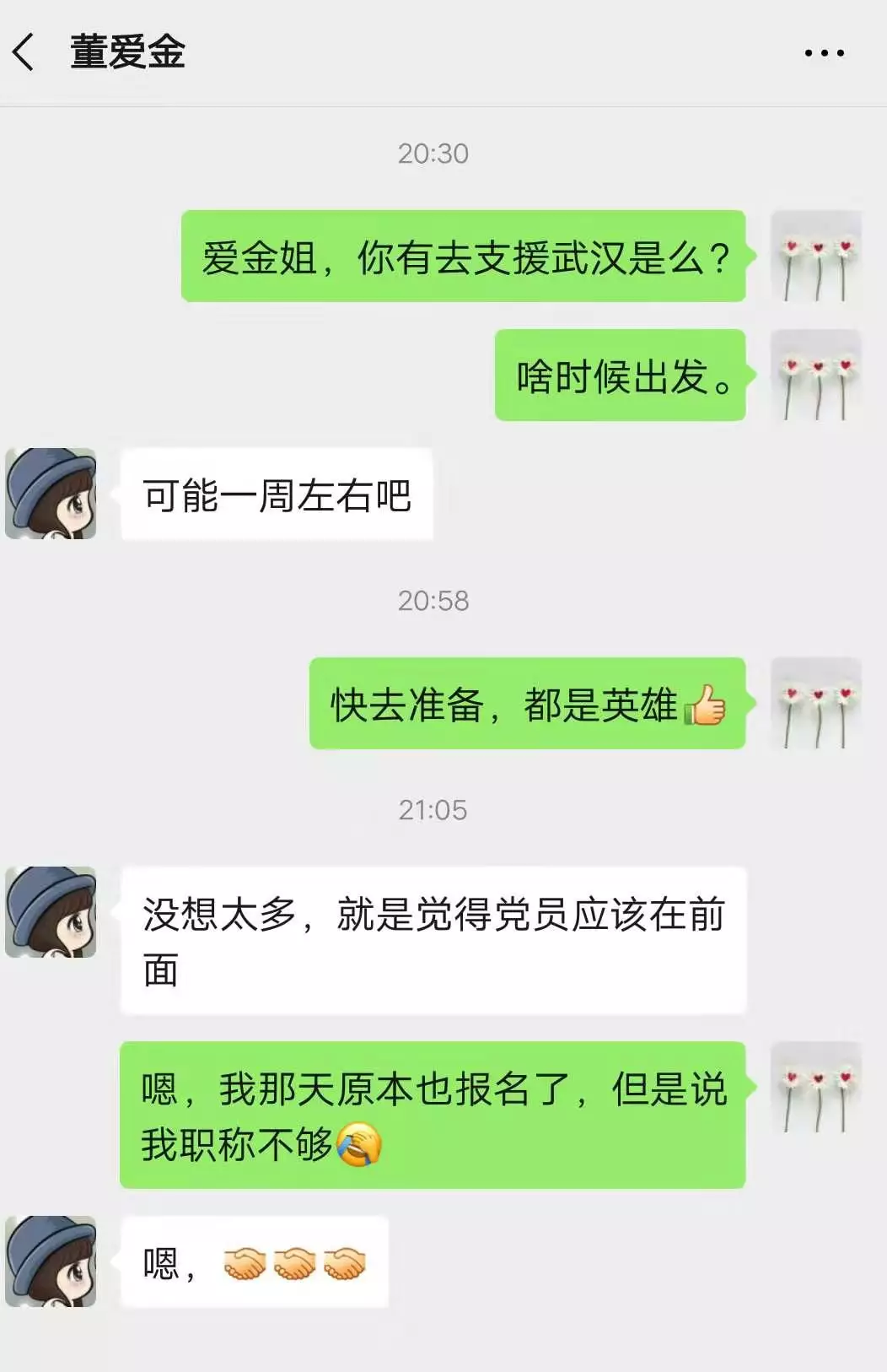 “领导,我报名去武汉!”简单的8个字在这关键时刻如同窗外暖阳给这个寒冷的冬天一个温暖的拥抱。有着党龄和工龄(12年)一样长的董爱金护士,开朗直率。在湖北疫情牵动全体医务人员的心时,当她获到黄播 党委发出驰援湖北武汉的通知后,她毫不犹豫地报名参战。在明知两个年幼的孩子,除了爱人就没有其他人可以帮忙照顾的情况下,她依然义无反顾地请战,和家里人来个了“先斩后奏”。爱人得知后虽然内心为妻子的此趟出行担心,但还是给予了极大的支持,让她没有后顾之忧的前往一线支援。