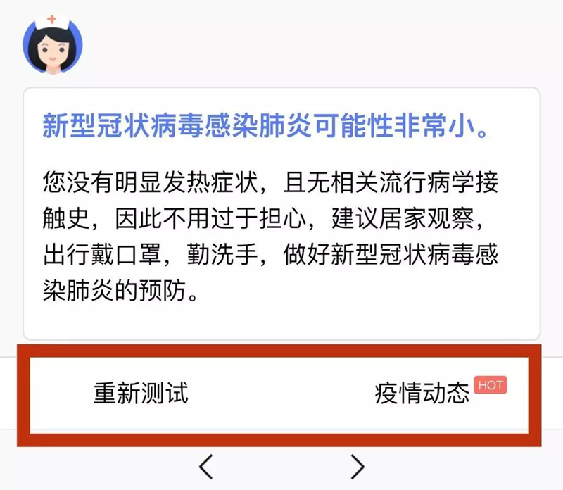 按照系统提示,用户只需要回答相应的问题,并会持续根据权威指南等知识更新。如是否有发热、咳嗽等不适症状,或者近期是否到过武汉等信息,“发热自查”工具即可给出风险评估。
