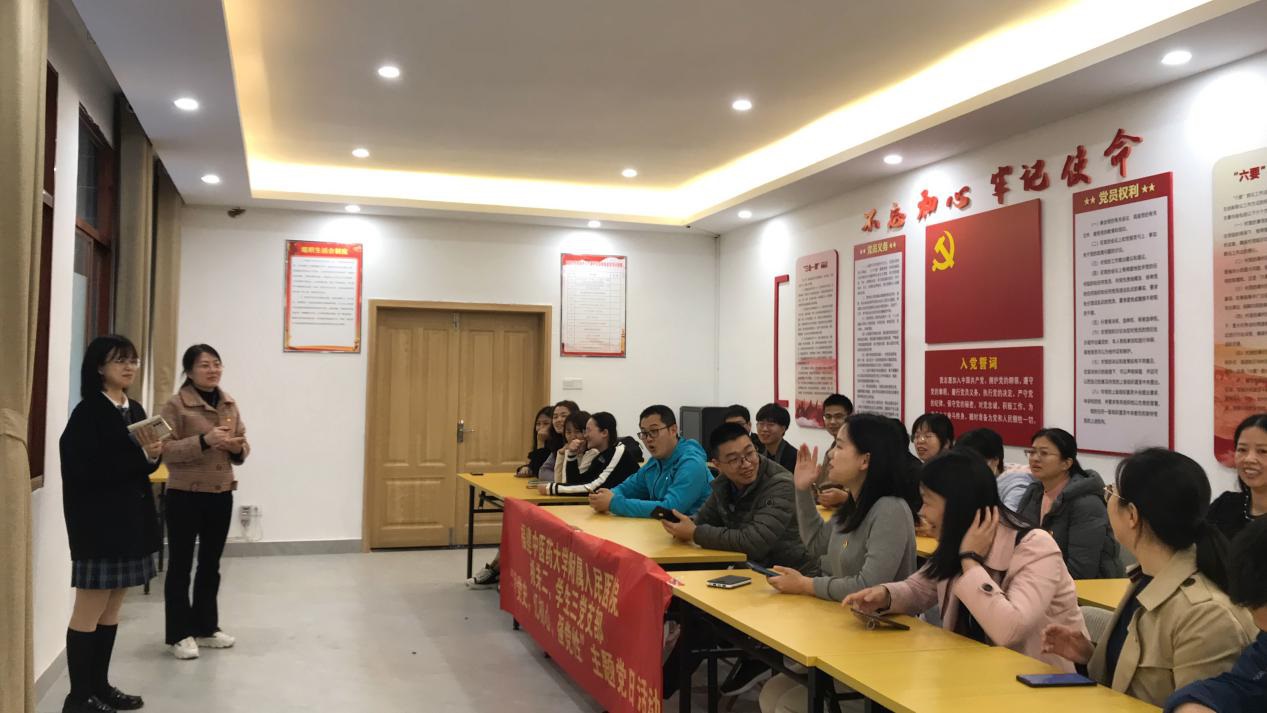 为庆祝中国共产党建党100周年,贯彻落实党中央关于加强党史学习教育的重要精神,当晚,机关二党支部与学生三党支部组织全体党员举办了以“学党史,忆初心,强党性”为主题的党史知识竞赛。通过自由组队的方式党员们分成“学党史”队、“忆初心”队和“强党性”队三支队伍,知识竞赛分为必答题、抢答题和听歌识曲三个环节。活动现场紧张激烈,党员们情绪高涨、从容答题,不时迎来阵阵掌声。特别是“听歌识曲”环节,一首首经典红歌将现场氛围推向了高潮。最终机关二支部的“强党性”队胜出,荣获第一名,学生三支部的“学党史”队、机关二支部“忆初心”队分别获得二、三名。通过此次党史知识竞赛活动,党员同志们对党的发展史有了更深刻理解,进一步增强了党支部的凝聚力和团结协作意识,达到了以赛促学的目的。