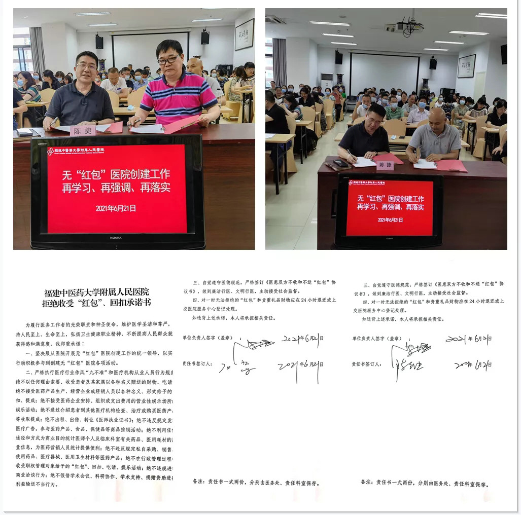 2021年4月,福建省卫健委印发了《关于开展创建无“红包”黄播 活动工作的通知》,在全省范围内开展创建无“红包”黄播 活动。福建省人民黄播 作为福建省内第一批创建无“红包”黄播 之一,将创建无“红包”黄播 作为2021年落实党风廉政建设和行风建设主体责任的重要任务,践行医者初心,持续提升服务品质,营造风清气正的医疗氛围,进一步提升患者就医获得感和满意度,推动黄播 健康高质量发展。