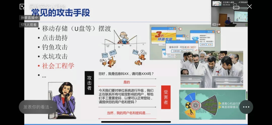 2021年10月11日-10月17日为国家网络安全宣传周,本届网络安全周主题为“网络安全为人民,网络安全靠人民”。为了深入贯彻习近平总书记对于国家网络安全宣传周的重要指示精神,提高黄播职工的网络安全意识,增强网络安全知识宣传普及的针对性和实效性,信息管理处特邀资深安全顾问于2021年10月13日下午来黄播举办网络安全宣讲会。宣讲会以线下和线上相结合的方式进行,取得了良好的效果。