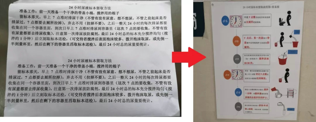 对于“24小时尿标本的留取”,护士们除了口头对病人讲解,还将宣教文字转化成形象生动、便于理解的流程图,在每个病房里都张贴一张,让患者能够清晰的理解如何留取24小时尿标本。