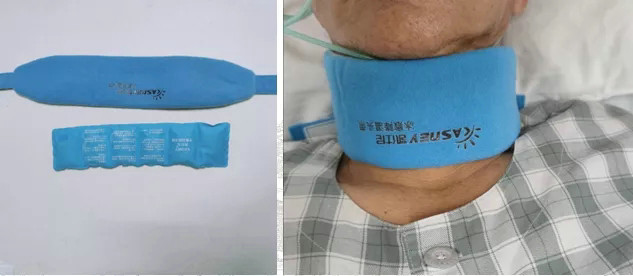 甲状腺微波消融术后患者,需要用冰袋冷敷,防止术后伤口出血,预防颈部肿胀,缓解疼痛。但是冰敷颈部的过程中,患者需要用毛巾包裹冰袋,并一直用手扶冰袋,影响活动与休息,很不方便。于是,胸心外科的护士采购了颈部专用冰敷带,可以有效固定颈部冰袋并且能调节松紧,真正解放患者双手,还不影响冰敷治疗。