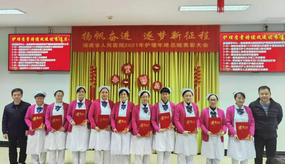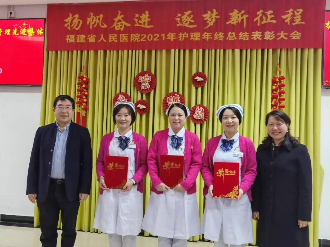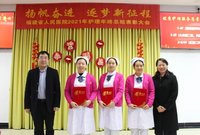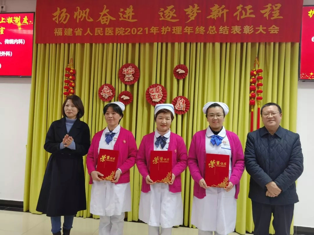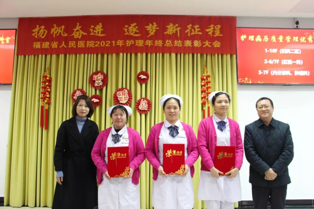 赵红佳书记、陈捷院长为 “2021年度优质护理服务质量先进集体”:1-4F(重症医学科)、3-2F(心血管二区、风湿病科)、2-8/9F(肛肠二科)颁发证书