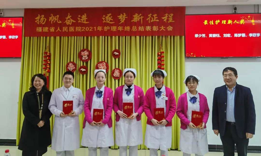 赵红佳书记、陈捷院长为“2021年度最佳护理新人奖”:缪少芳、黄碧钰、刘宏、陈梦蓉、李欣宇颁发证书