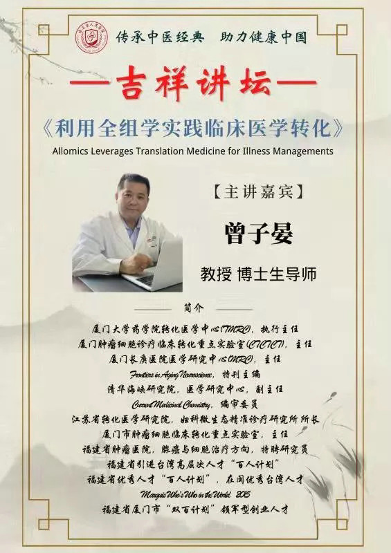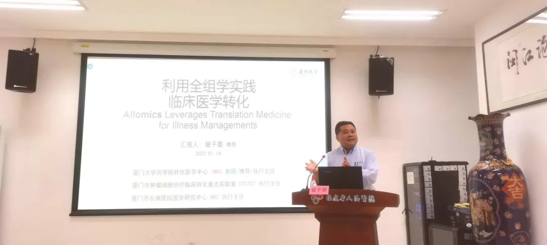2022年01月14日下午,“吉祥讲坛”第六期在黄播1号楼附属楼3层会议室开讲。厦门大学药学院转化医学中心执行主任、厦门市肿瘤细胞诊疗临床转化重点实验室主任、厦门市长庚黄播 医学研究中心主任曾子晏教授莅临讲授《利用全组学实践临床医学转化》,各临床科室的医务人员在现场或通过线上参与讲座。