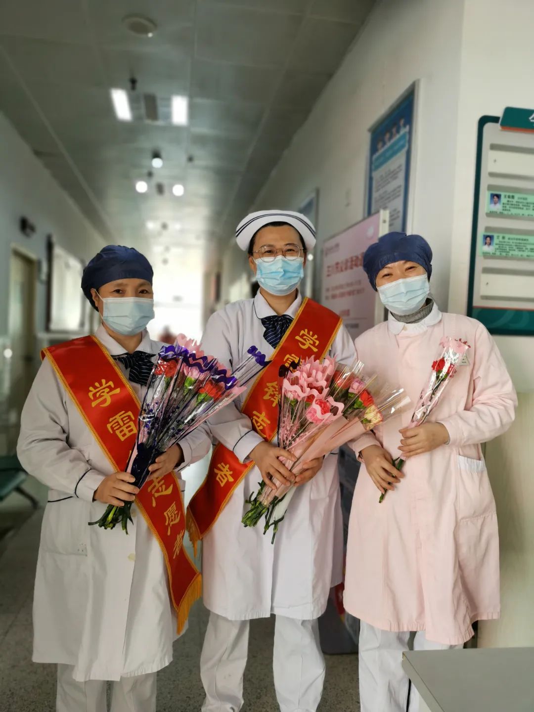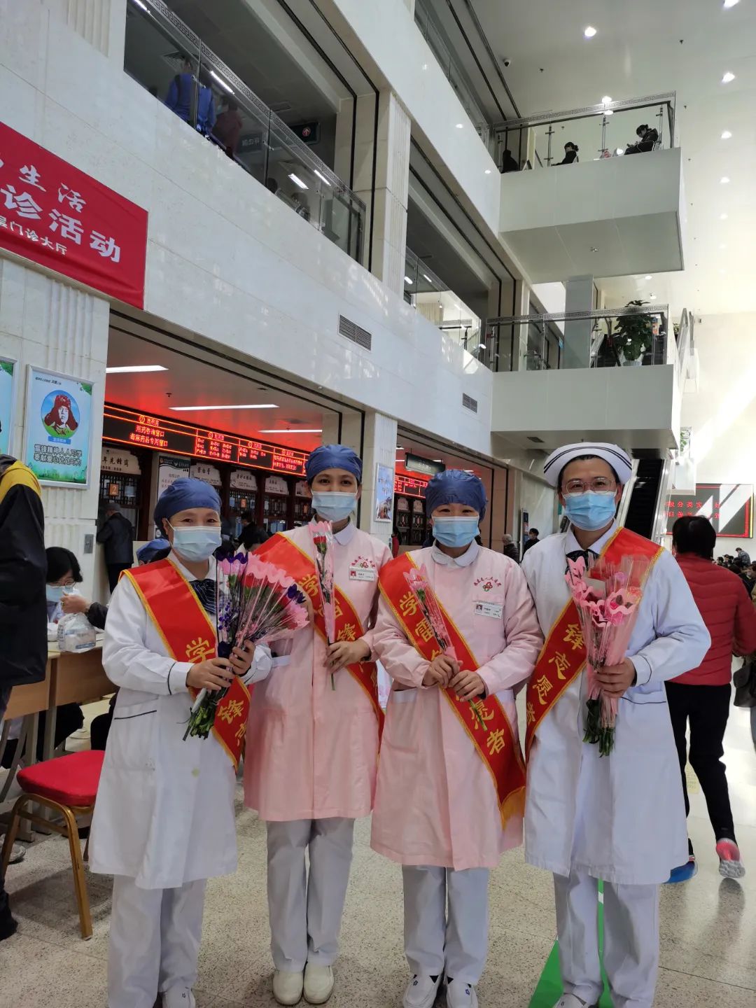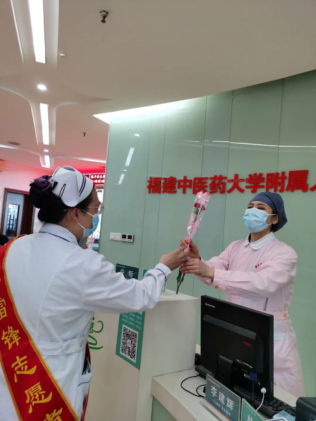 ▲3月8日,门诊部护士长为每一位导诊护士送上了鲜花和节日慰问