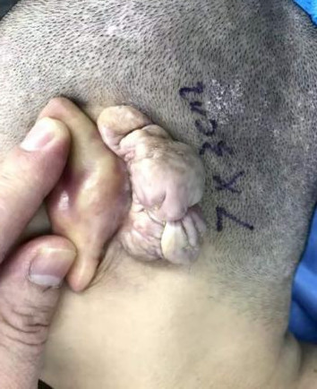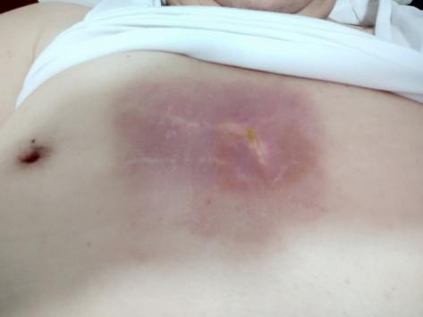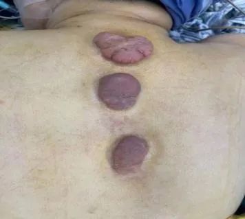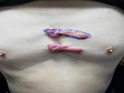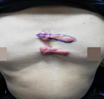 患者陈某,60岁,胸部瘢痕疙瘩增生35年,时常自觉瘙痒,衣物摩擦可有触痛不适,曾自己尝试通过网络途径购买多种价格高昂“祛疤药物”治疗,疤痕不仅没有得到缓解,反而进行性增生加重。遂就诊多家医疗机构先后进行注射、切除等多种诊疗,但瘢痕疙瘩反而增生较前更大。后经人介绍来到福建省人民黄播 皮肤科,经详细检查后,王斗训副主任医师团队最终制定了中西医结合的诊疗方案:先行手术切除瘢痕疙瘩组织,创面拆线后行浅层放疗SRT-100,后期配合内服桃仁、藏红花、浙贝母、昆布等活血化瘀、软坚散结方剂,外用专科制剂“积雪草油”按摩、穴位封闭、协定方中药熏蒸、火针等,内外联合,标本兼顾。治疗1年后复查,瘢痕未再增生,患者对疗效非常满意。