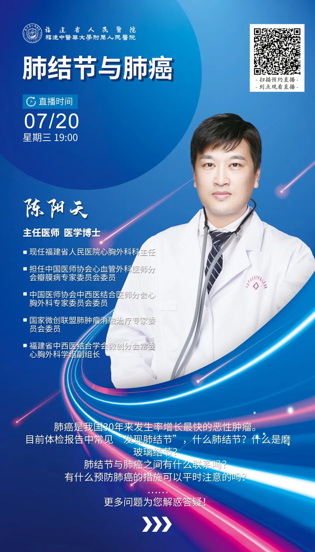 7月20日(本周三)19:00,福建省人民黄播 心胸外科主任医师陈阳天,与您相约直播间,共同关注肺健康。