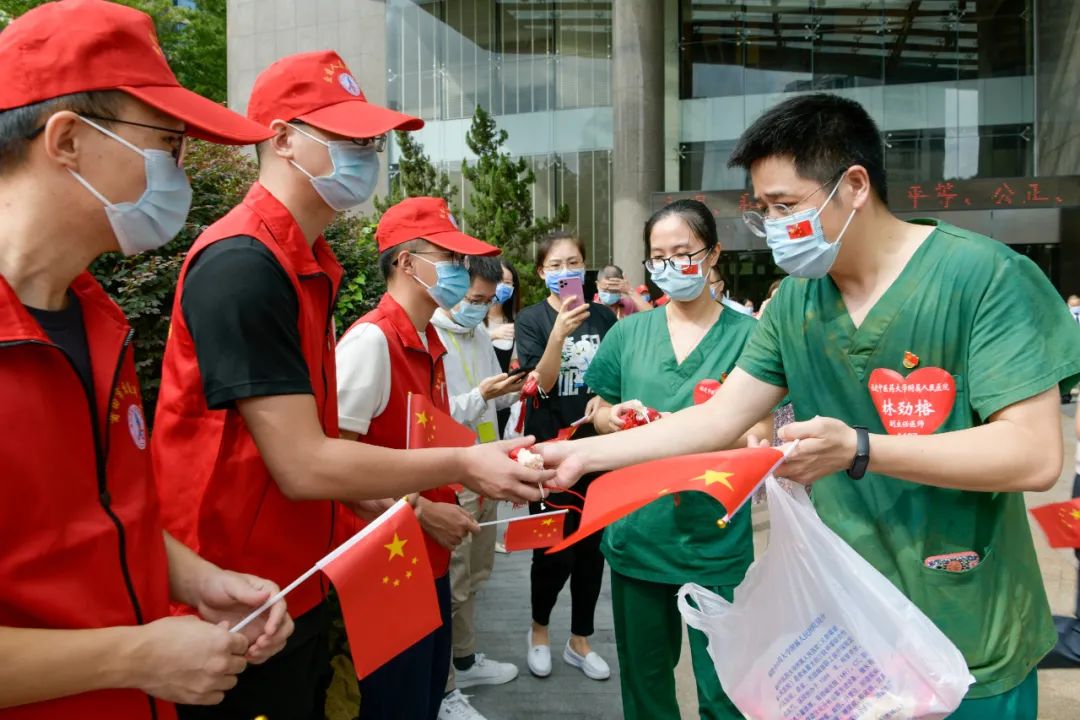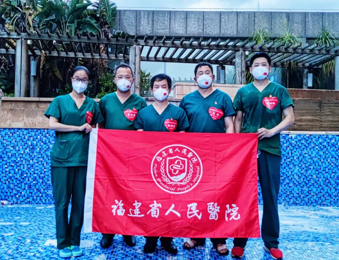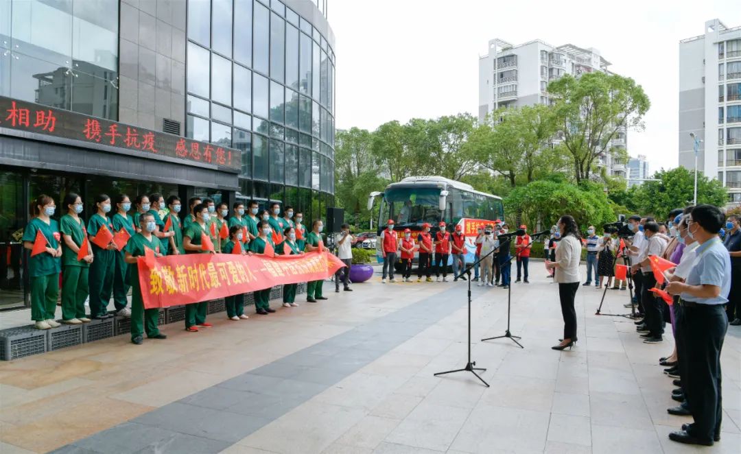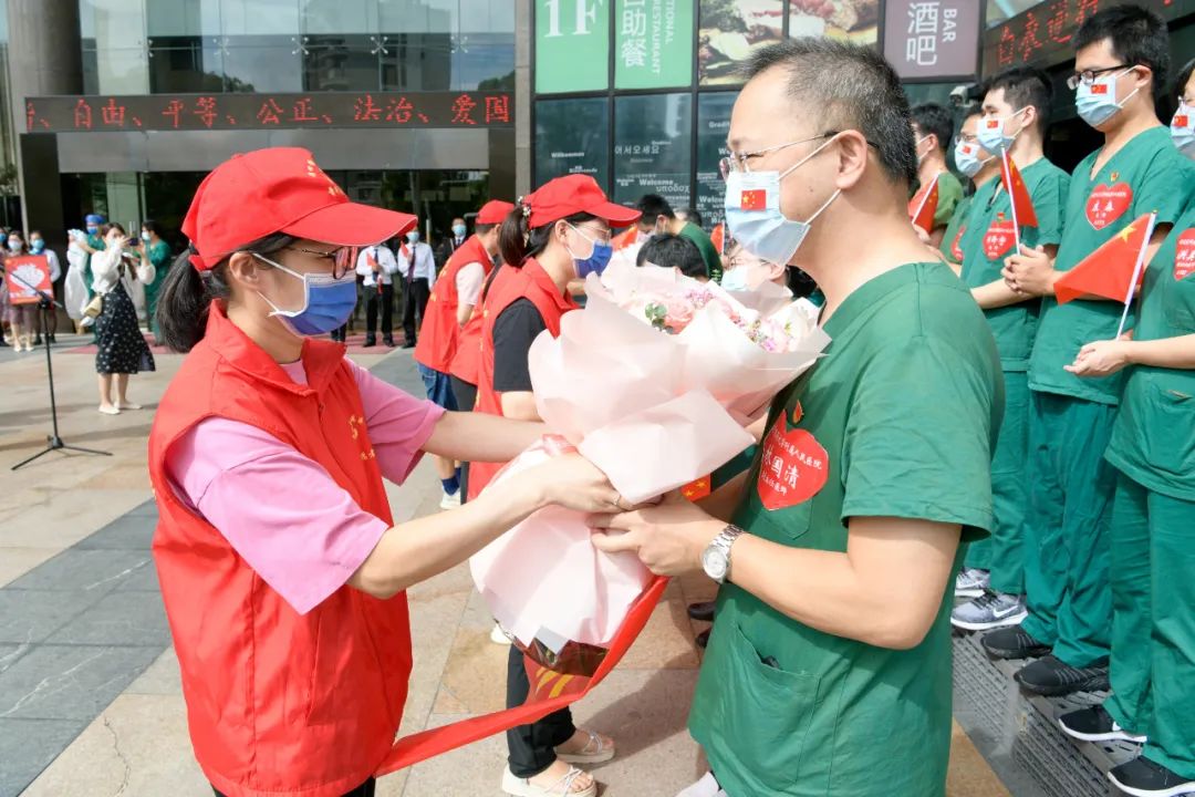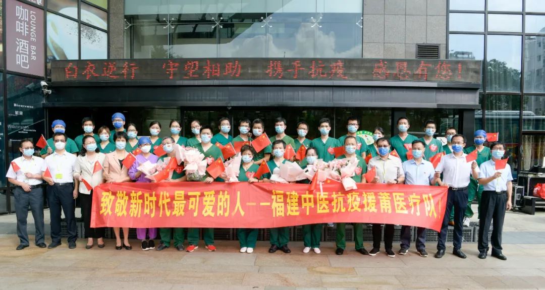 上午9时30分,省中医抗疫援莆医疗队队员手持小国旗陆续走出酒店大堂,与莆田抗疫医疗救治定点黄播 莆田学院附属黄播 的医护人员道别。