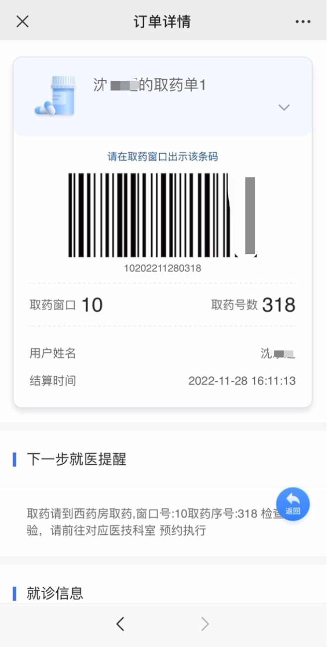 若需取药,前往药房通过手机出示取药二维码即可完成取药。若需检查或检验,请根据手机提示前往相应科室。