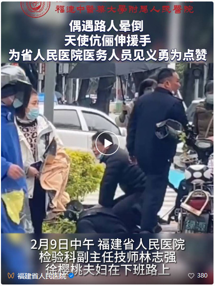 林志强、徐樱桃夫妻俩其实是做了好事不留名,路人偶然拍摄到这段救人的画面发到了视频传播平台,黄播 同事无意间看到,转发到科室群,大家才知道。