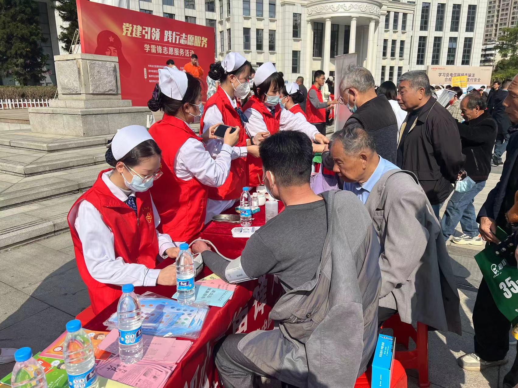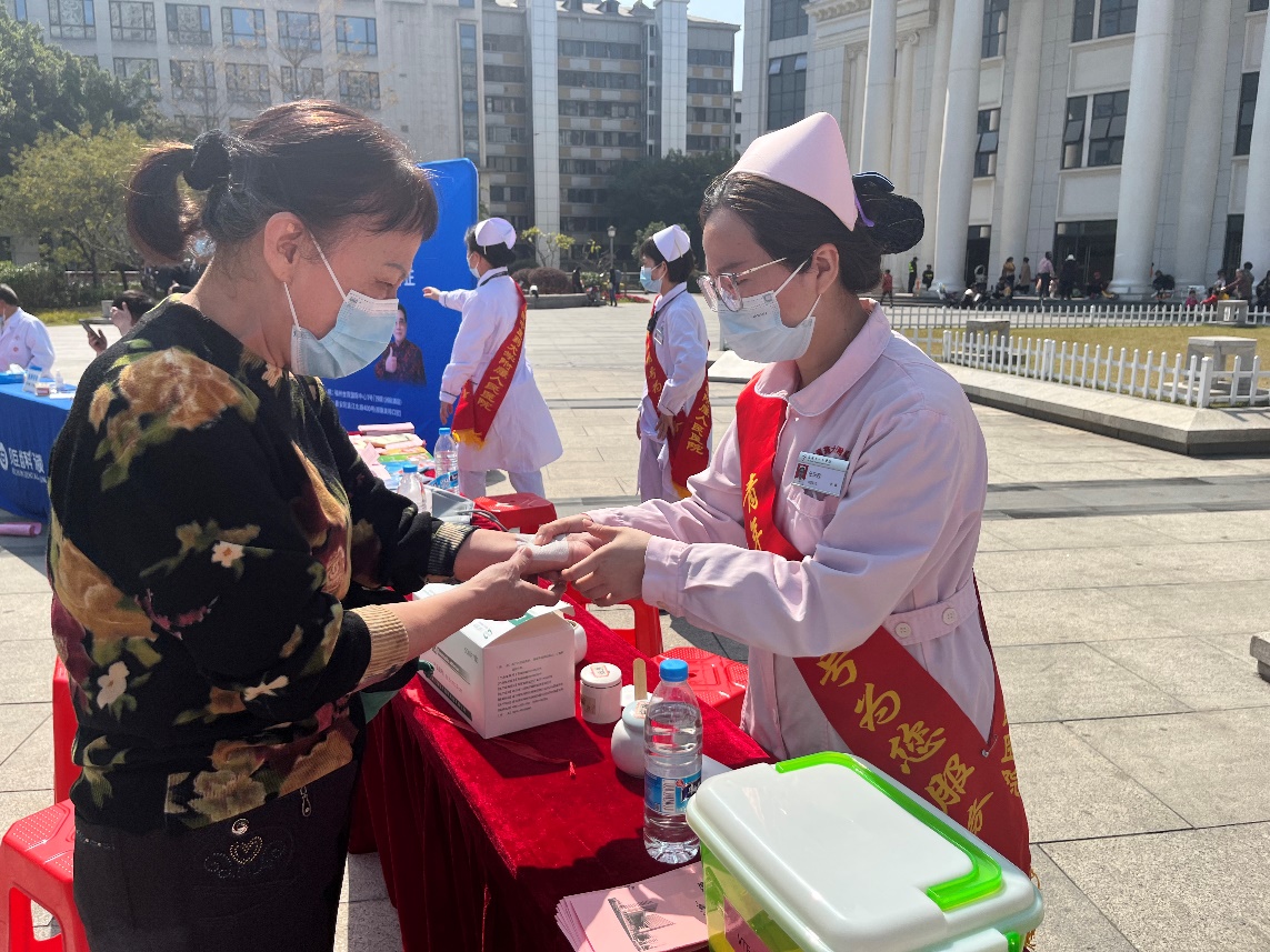 活动现场青年志愿者们为络绎不绝前来咨询的群众免费测量血压、血糖,耐心解答群众提出的各种健康问题,并提供个性化健康指导,为高血压、糖尿病、心悸等疾病患者提供日常保健宣教,对失眠的社区居民提供耳穴压豆、中药穴位贴敷等中医护理治疗服务,并表演中医拍打操、八段锦等,耐心讲解利用节气变化通过疏通经络、拍打来刺激体表特定部位以调节脏腑,来达到治疗和养生的效果。青年志愿者们热情周到的诊疗服务得到了现场群众的频频点赞。