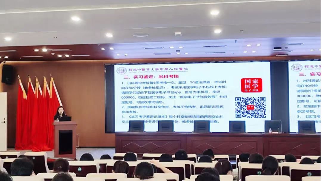 教务处薛敬英老师为同学们讲述了临床实习的要求,包含出科理论和技能考核、病历书写要求、考勤制度及优秀实习生评选细则等。