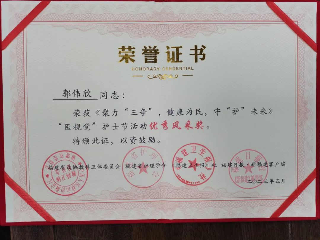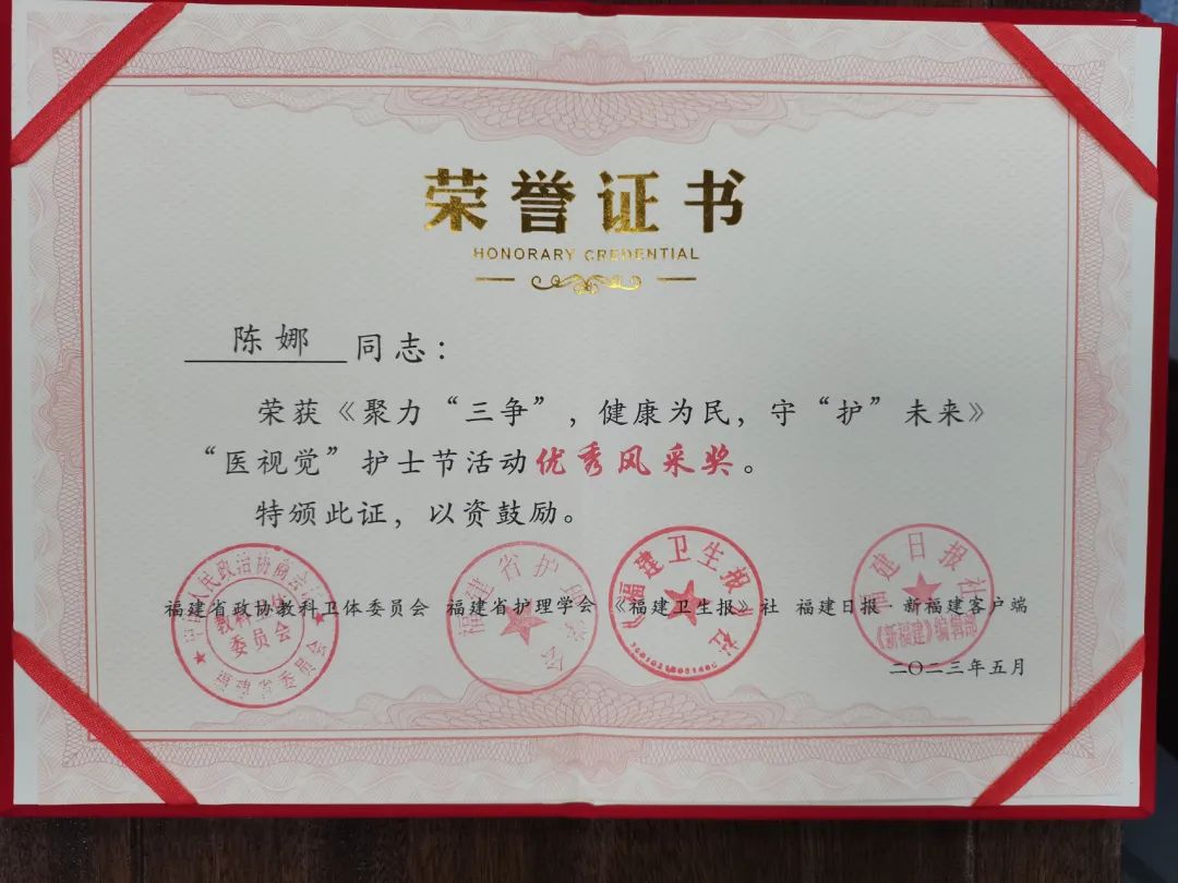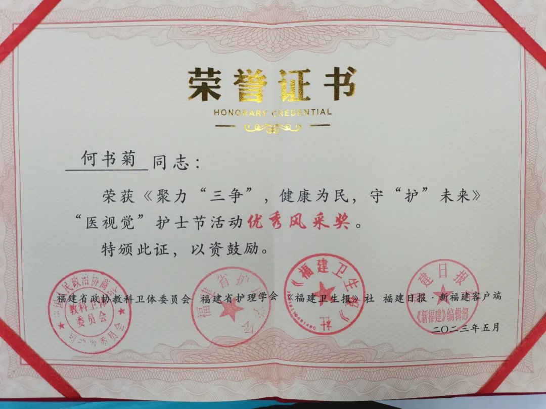 2023年“医视觉”护士节特辑——“聚力'三争',健康为民,守'护'未来”主题活动,由福建省政协教科卫体委员会、福建省护理学会、《福建卫生报》社、福建日报·新福建客户端联合启动,向全省各级卫生医疗机构征集图片。经评选,黄播 护理部、宣传部选送的三个参赛作品获得优秀奖,展现了黄播 护理团队的南丁格尔精神和人道、博爱、奉献的职业精神,彰显了新时代护理工作者的白衣风采。