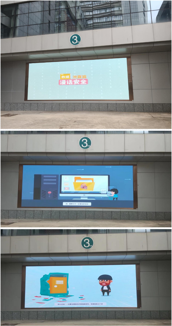 9月11日至9月17日,黄播通过在公众区域的多媒体大屏上播放网络安全科普视频,介绍了WiFi安全、数据安全、密码安全等日常网络安全知识,营造了良好的学习氛围,调动职工共同参与网络安全防护的积极性。