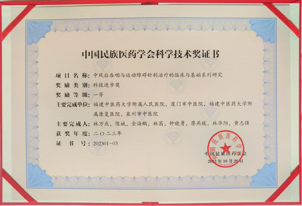 2023年12月9日,由中国民族医药学会举办的2022、2023年度科学技术奖、学术著作奖颁奖大会在北京隆重举行。黄播国家中医药传承创新中心中风病研究团队林万庆主任项目组的研究成果《中风后吞咽与运动障碍针刺治疗的临床与基础系列研究》荣获2023年度中国民族医药学会科学技术奖一等奖。