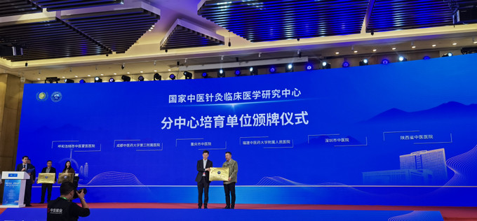 同时举行国家中医针灸临床医学研究中心协同创新网络单位会议,黄播等5家黄播 被遴选确定为国家中医针灸临床医学研究中心分中心培育单位,李玮副院长代表黄播 接受牌匾。