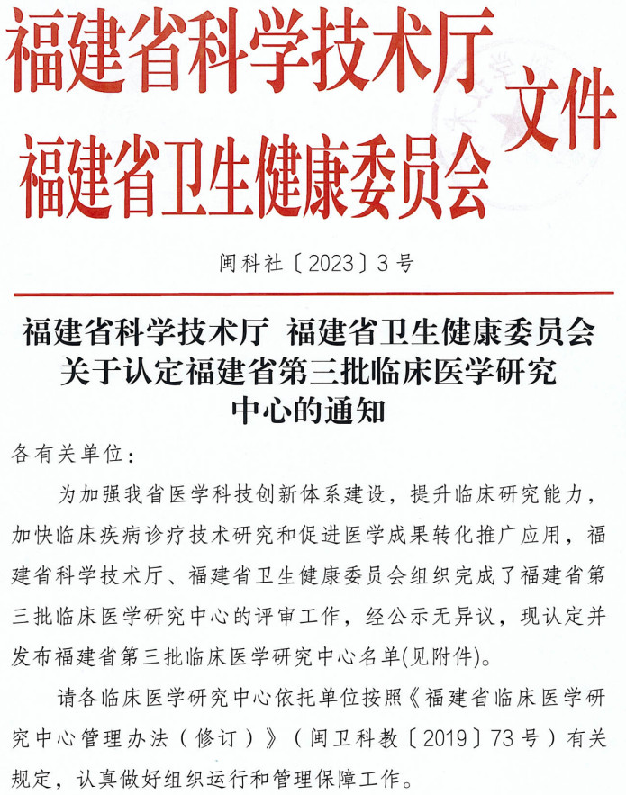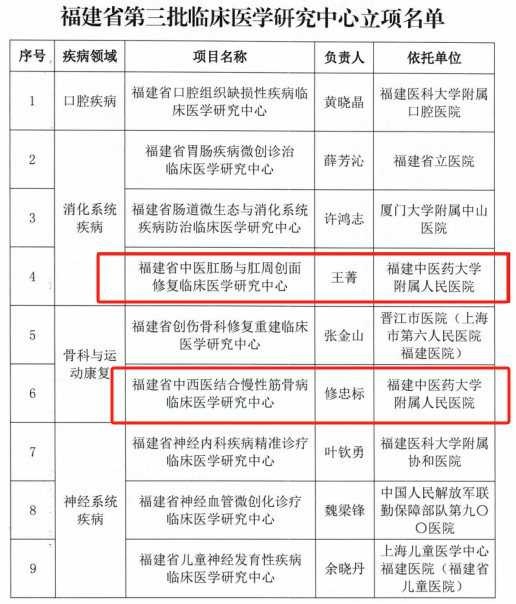 近日,福建省科学技术厅联合福建省卫生健康委员会共同发布了《关于认定福建省第三批临床医学研究中心的通知》(闽科社(2023)3号)。黄播再次获批两个省级临床医学研究中心,分别是“福建省中医肛肠与肛周创面修复临床医学研究中心”和“福建省中西医结合慢性筋骨病临床医学研究中心”。