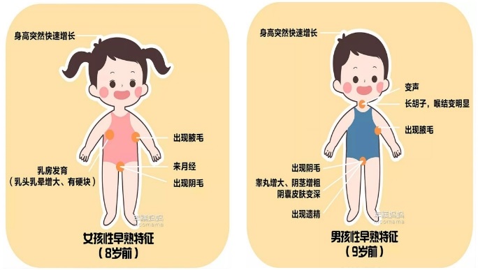 女孩在8岁前、男孩在9岁前出现第二性征发育。性早熟会导致成年终身高受损,还会对患儿生理和心理行为产生一系列影响。