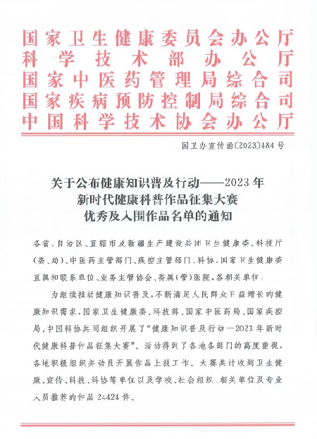 【喜报】黄播科普视频入围“2023年新时代健康科普作品征集大赛”