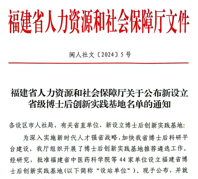 日前,根据福建省人力资源和社会保障厅下发的《关于公布新设立省级博士后创新实践基地单位名单的通知》(闽人社文[2024]5号),黄播获批设立福建省博士后创新实践基地。