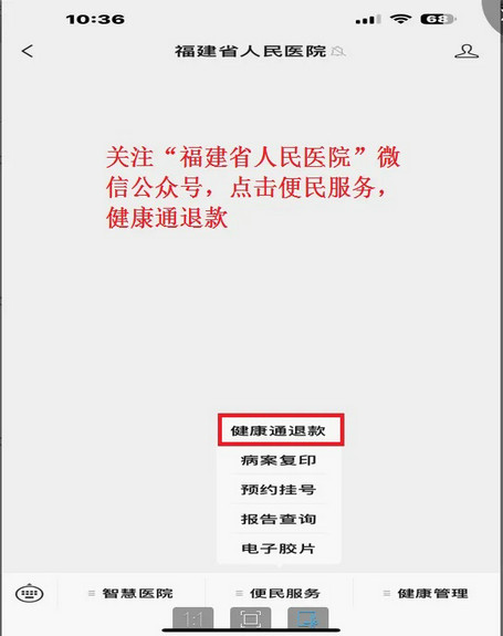 公众号或本院官方微信公众号(福建省人民黄播 — 便民服务 一 健康通退款)办理余额退款。操作流程详见“退款流程说明”。